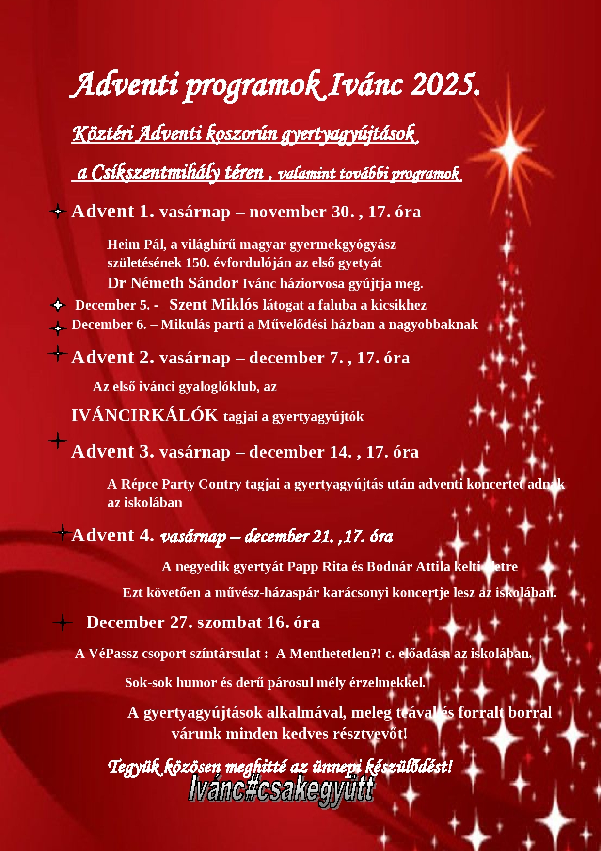 Az elmúlt évek pozitív tapasztalataiból merítve és a közösségünk összetartó erejének további növelésében bízva, újra várunk mindenkit a soron következő Adventi programjainkra.