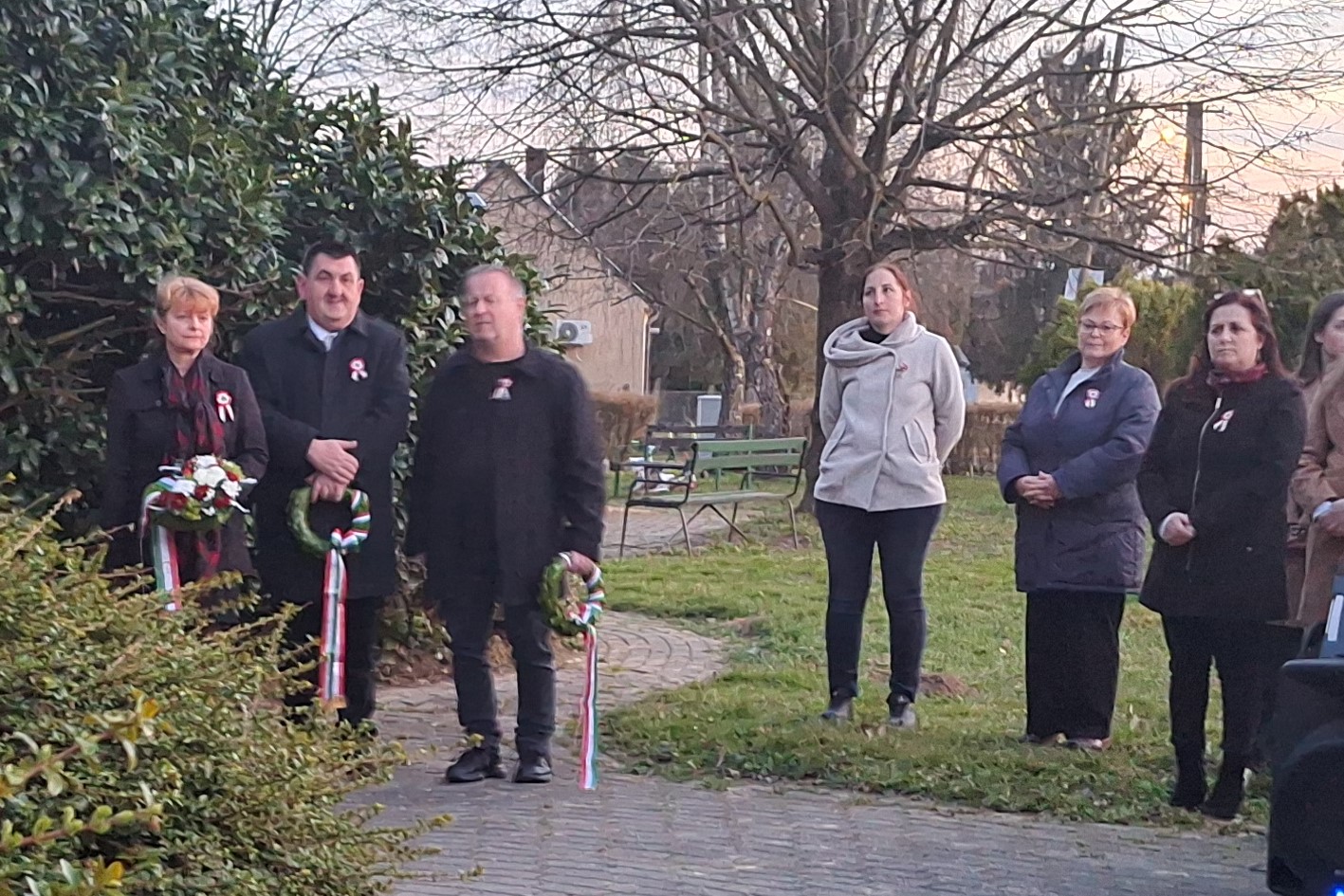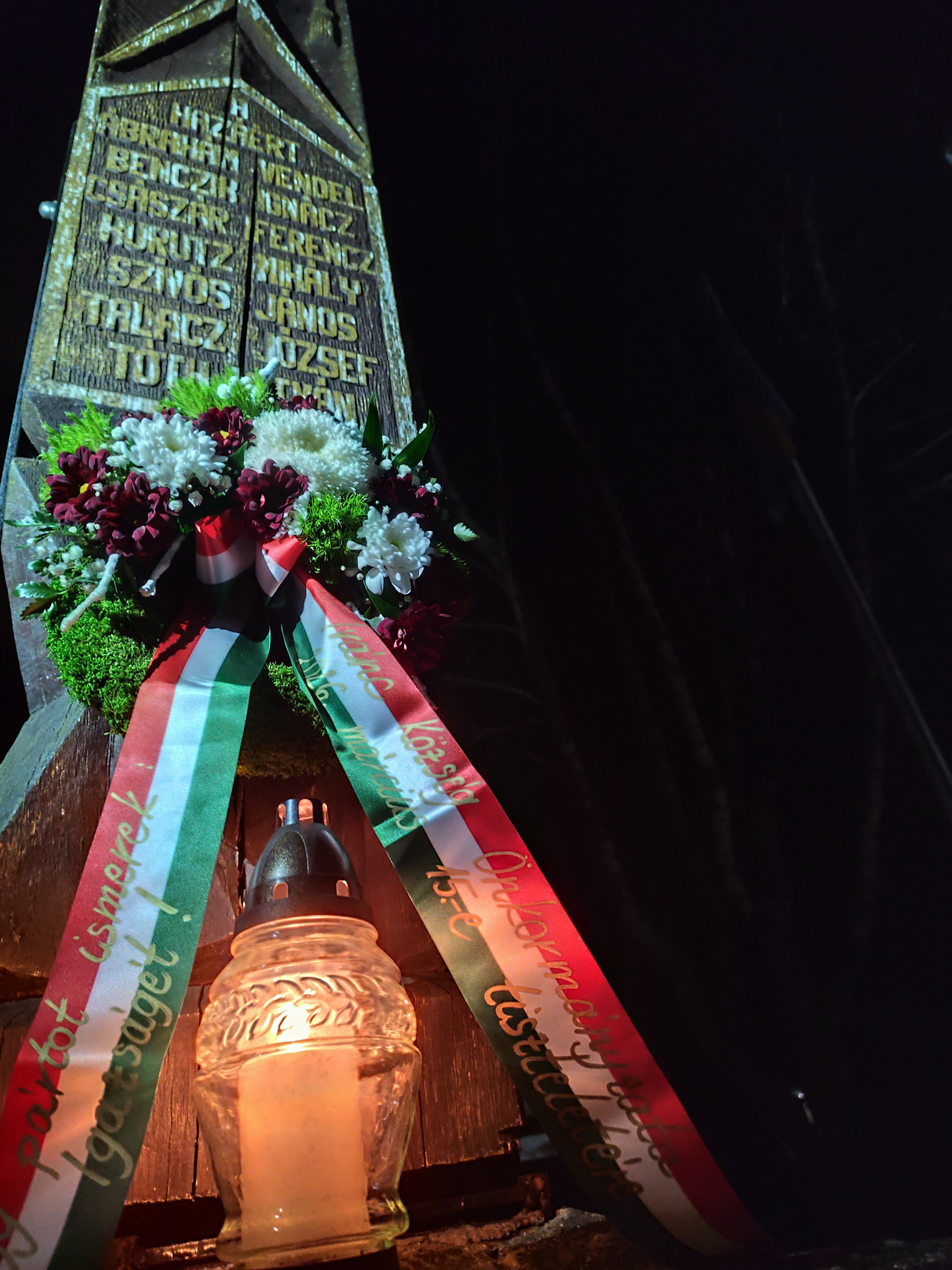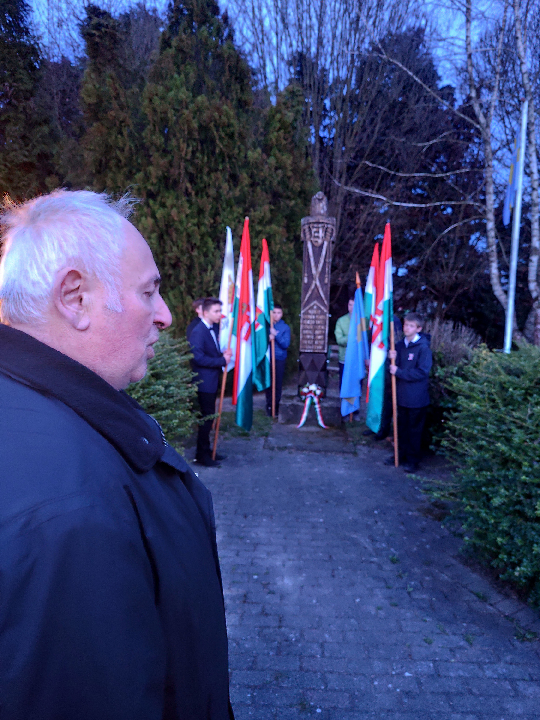Az alkonyatban gyülekezetünk a forradalom 178. évfordulójának előestéjén. Fiatalok zászlókkal kezükben állták körül az ivánci 48-as hősök emlékét őrző Nemzetőrök Kopjafáját.